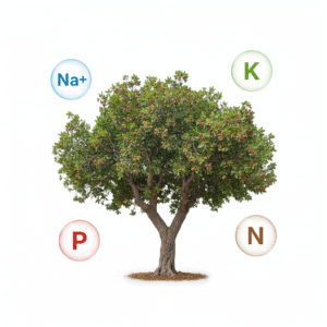پتاسیم (K):مهمترین و پرمصرفترین عنصر برای پسته. این عنصر به طور مستقیم مسئول پر شدن مغز پسته (کاهش انس)، افزایش مقاومت به شوری و سرما، و بهبود کیفیت کلی محصول است. باغات پسته ایران اغلب با کمبود پتاسیم مواجه هستند.
